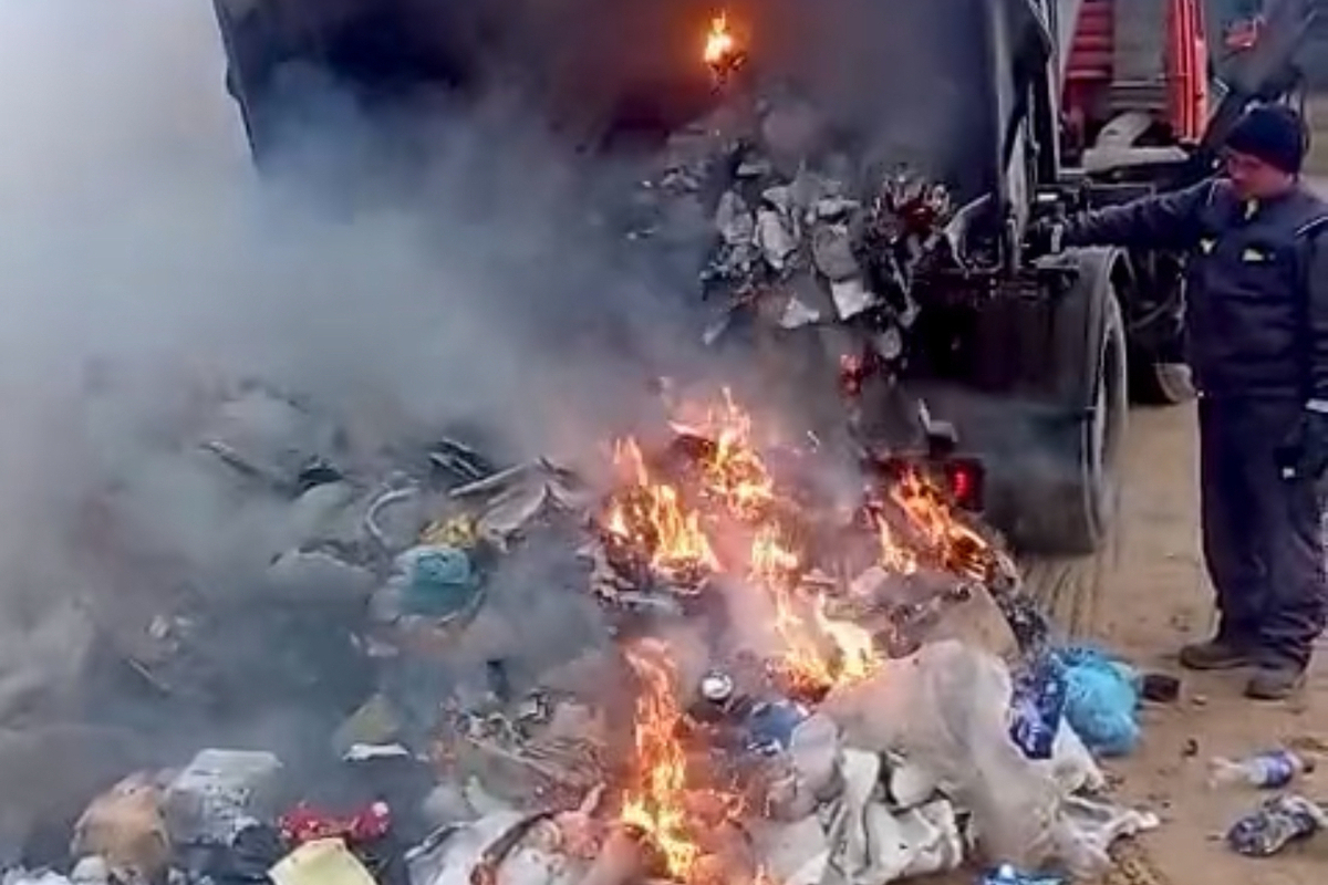 Экипаж мусоровоза через открытое окно почувствовал запах гари и сделал аварийную остановку. Выгружать горящий мусор пришлось прямо на дорогу.