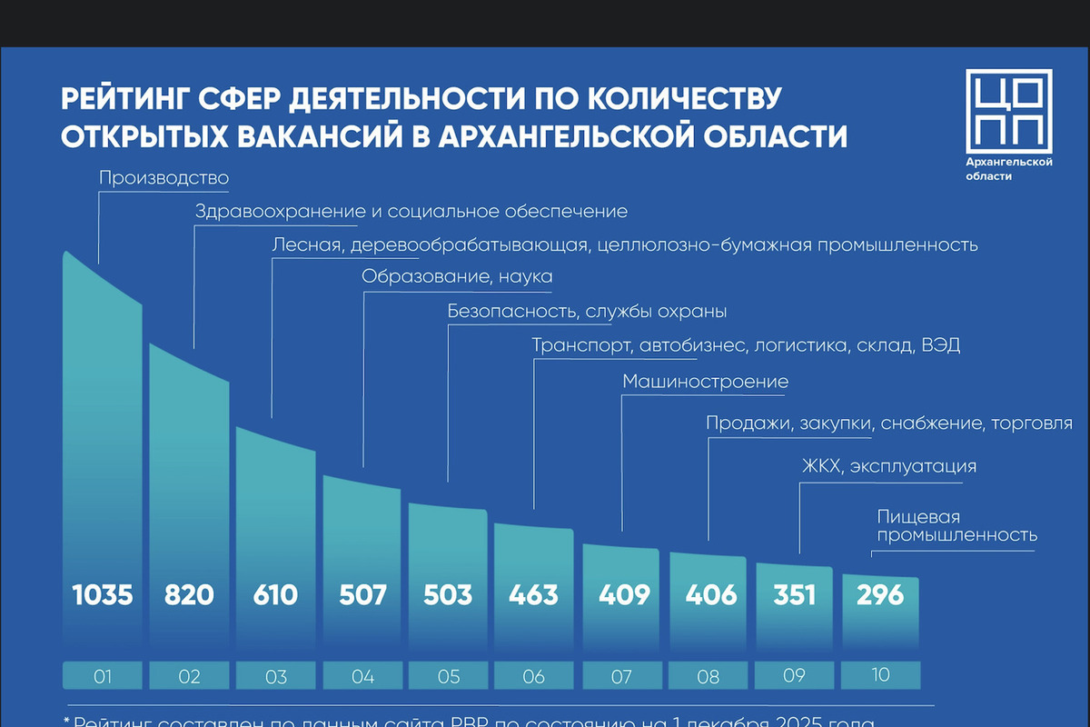 Аналитики Центра опережающей профессиональной подготовки представили рейтинг отраслей Архангельской области по количеству открытых вакансий. Данные актуальны на 1 декабря и собраны с государственного портала «Работа в России».